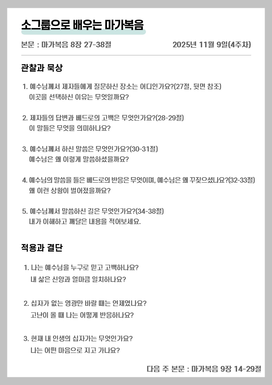 '소그룹으로 배우는 마가복음' 5주차 교안 (마가복음 8장 27-38절)