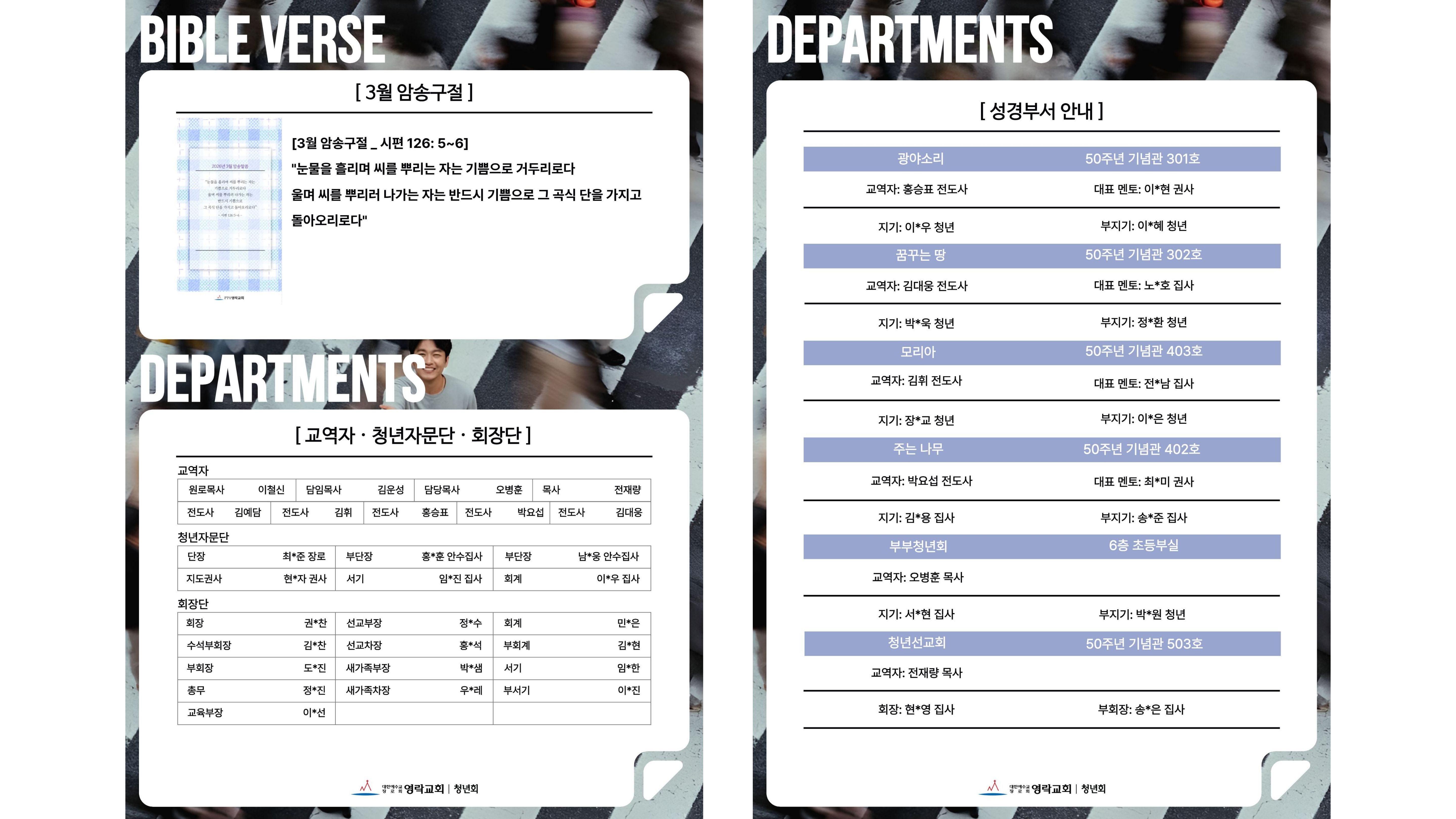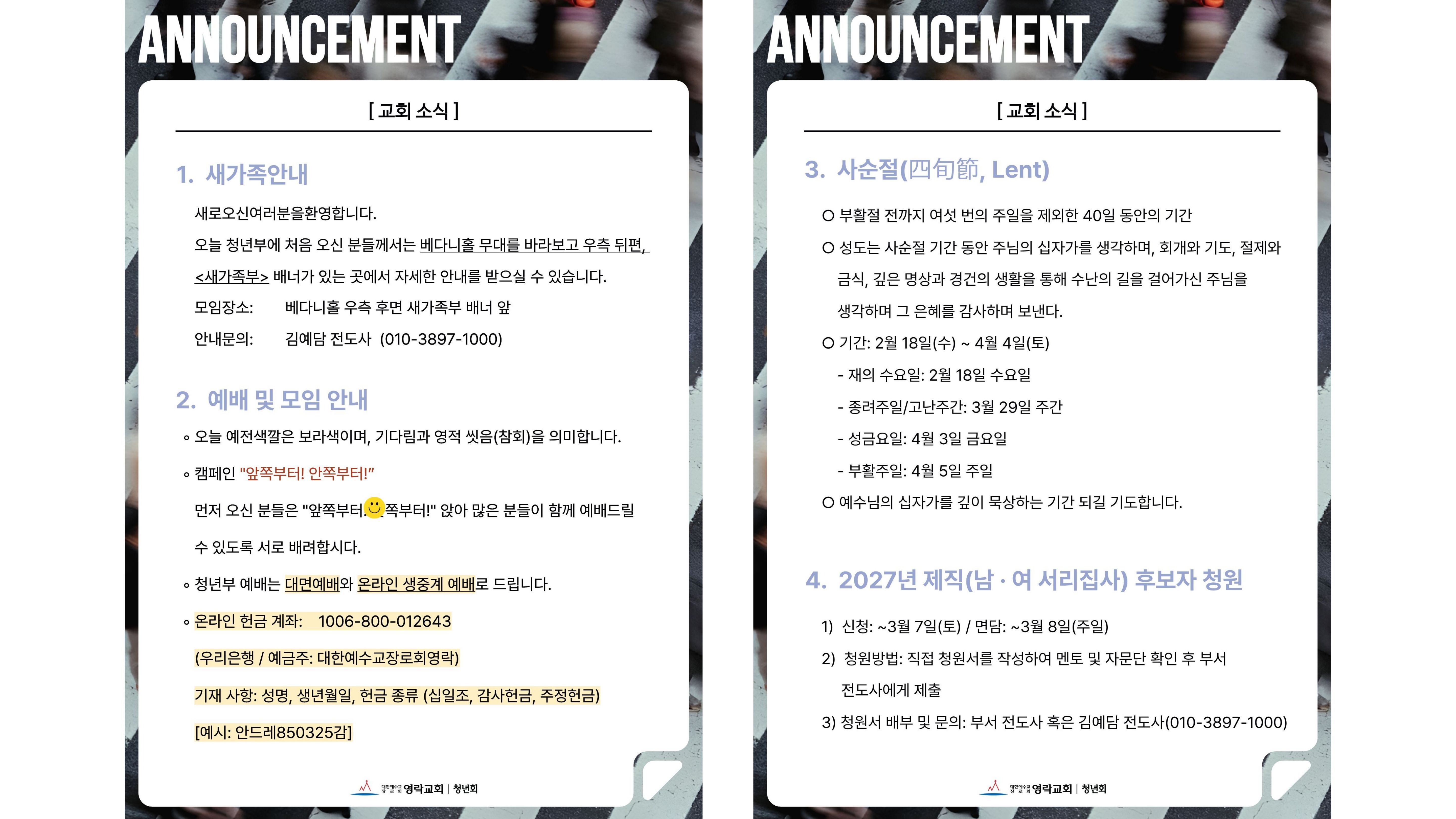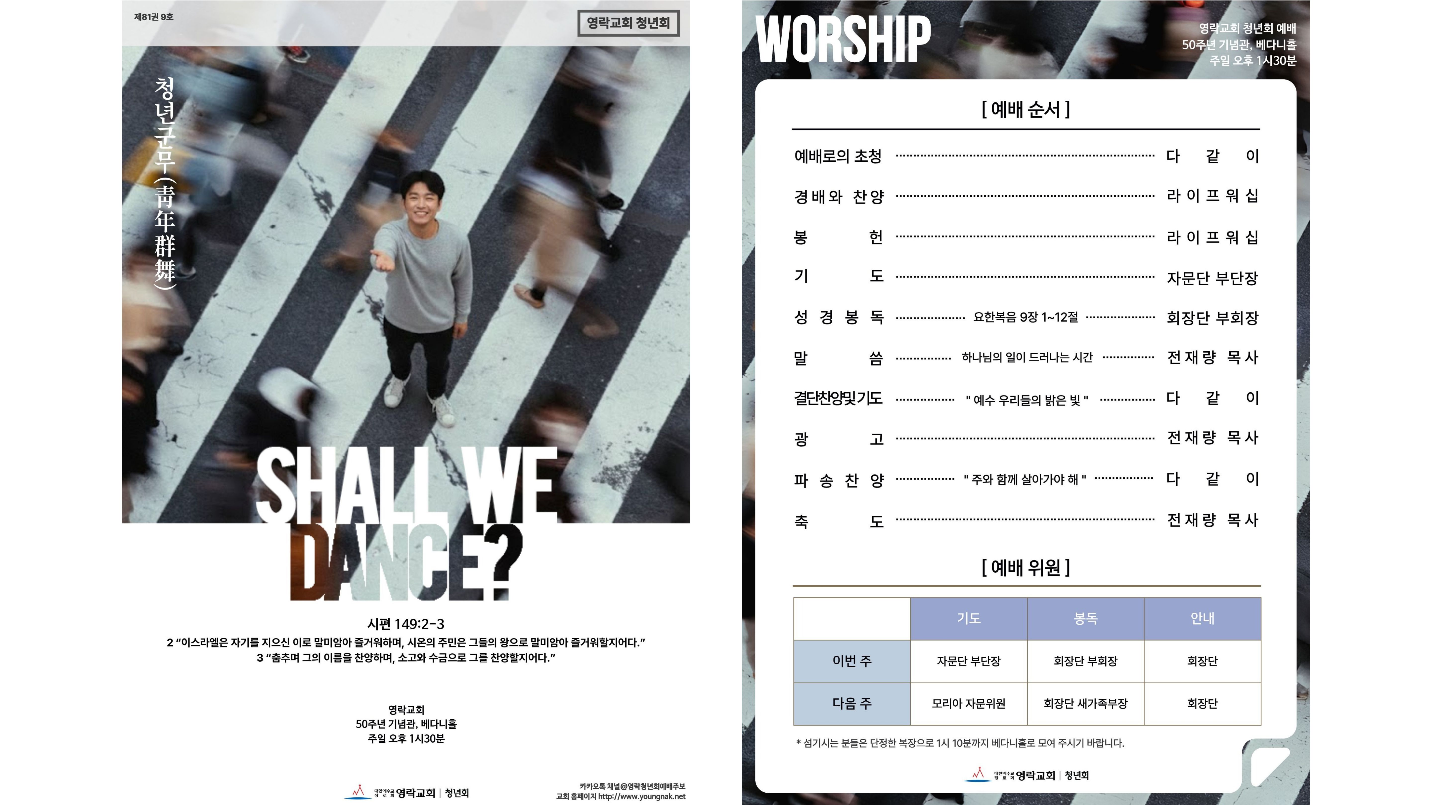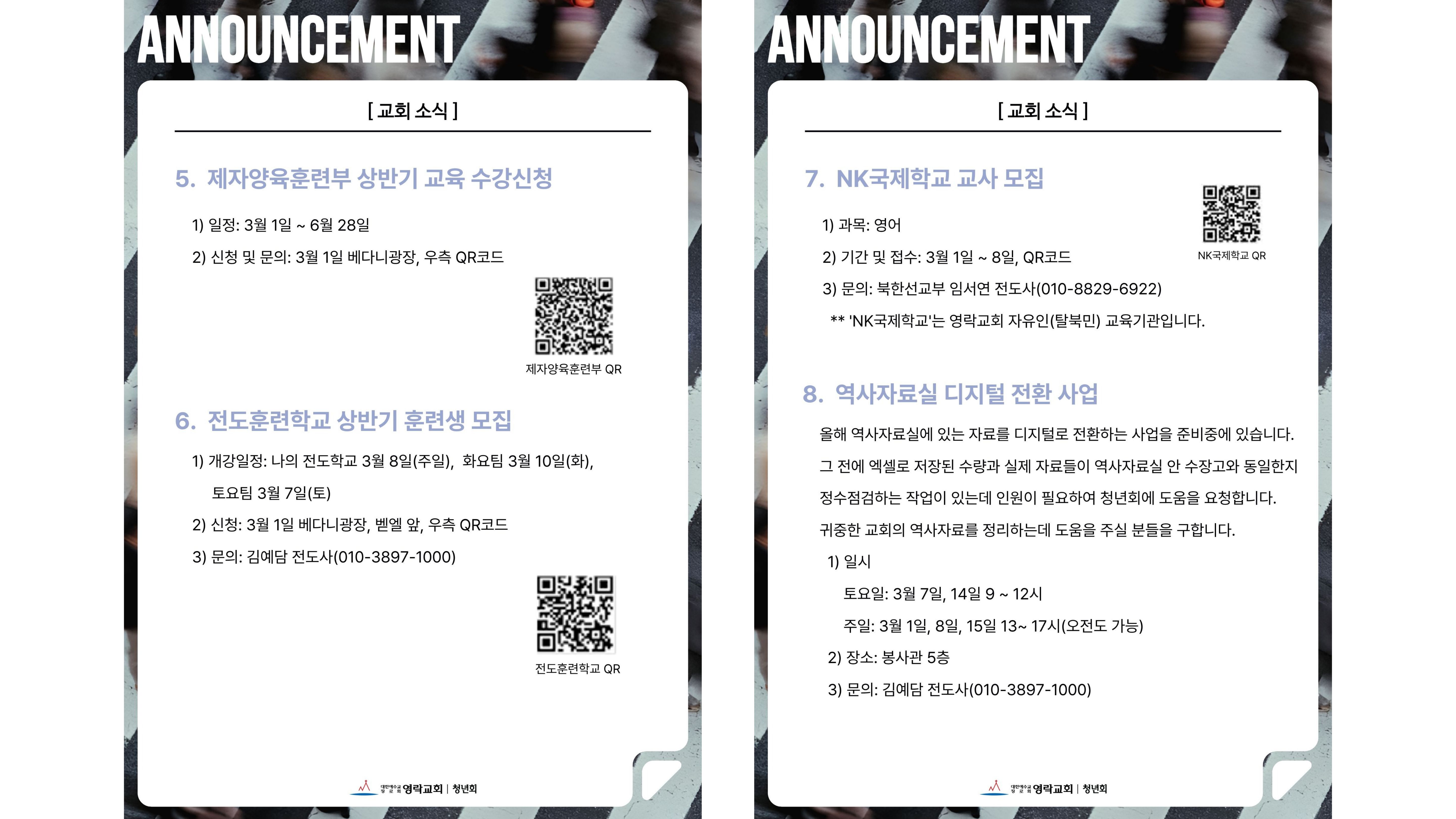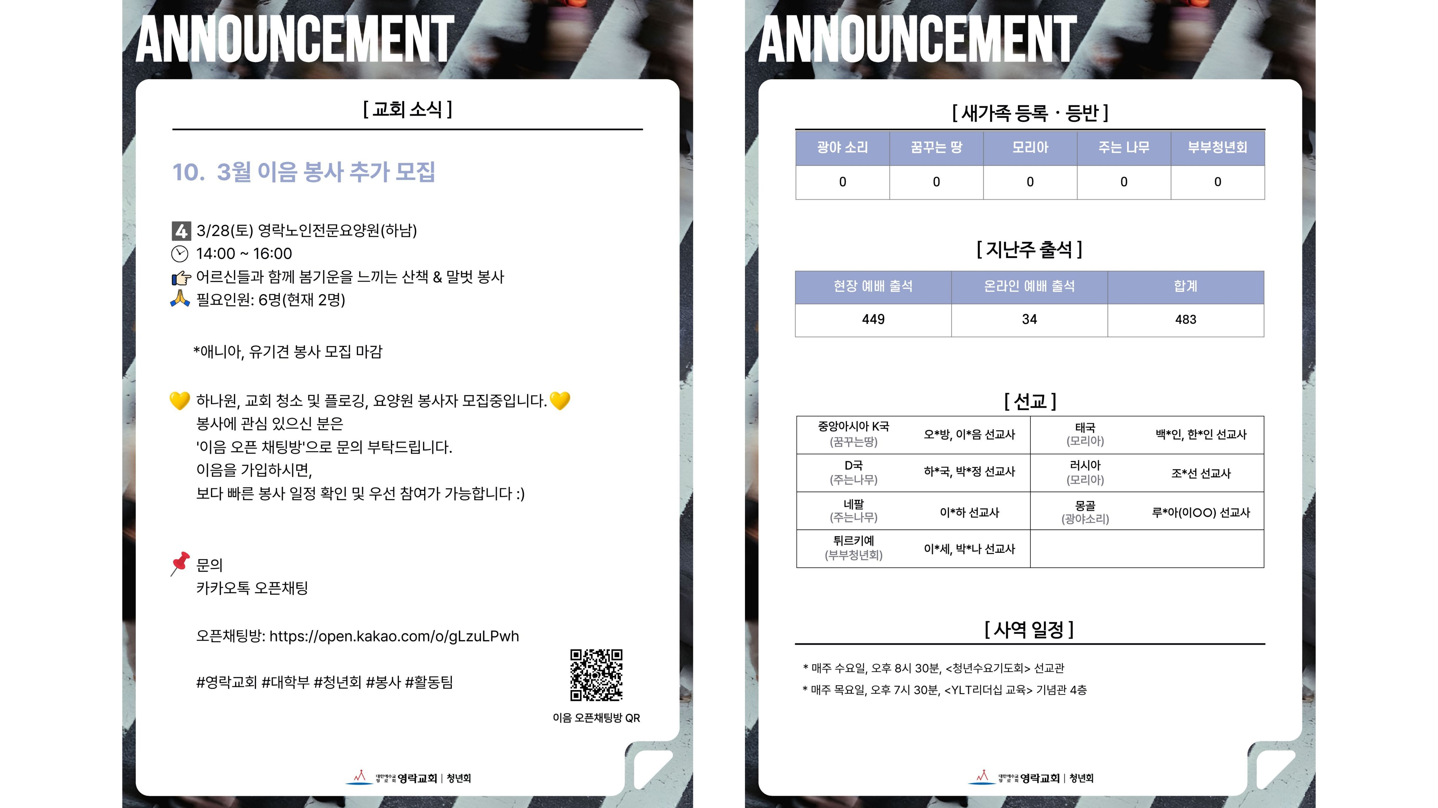 카카오톡 채널 @영락청년회예배주보 (http://pf.kakao.com/_Exmxofj) 를 친구추가하시면 매 주일 예배 시작 전 주보를 받아 보실 수 있습니다.