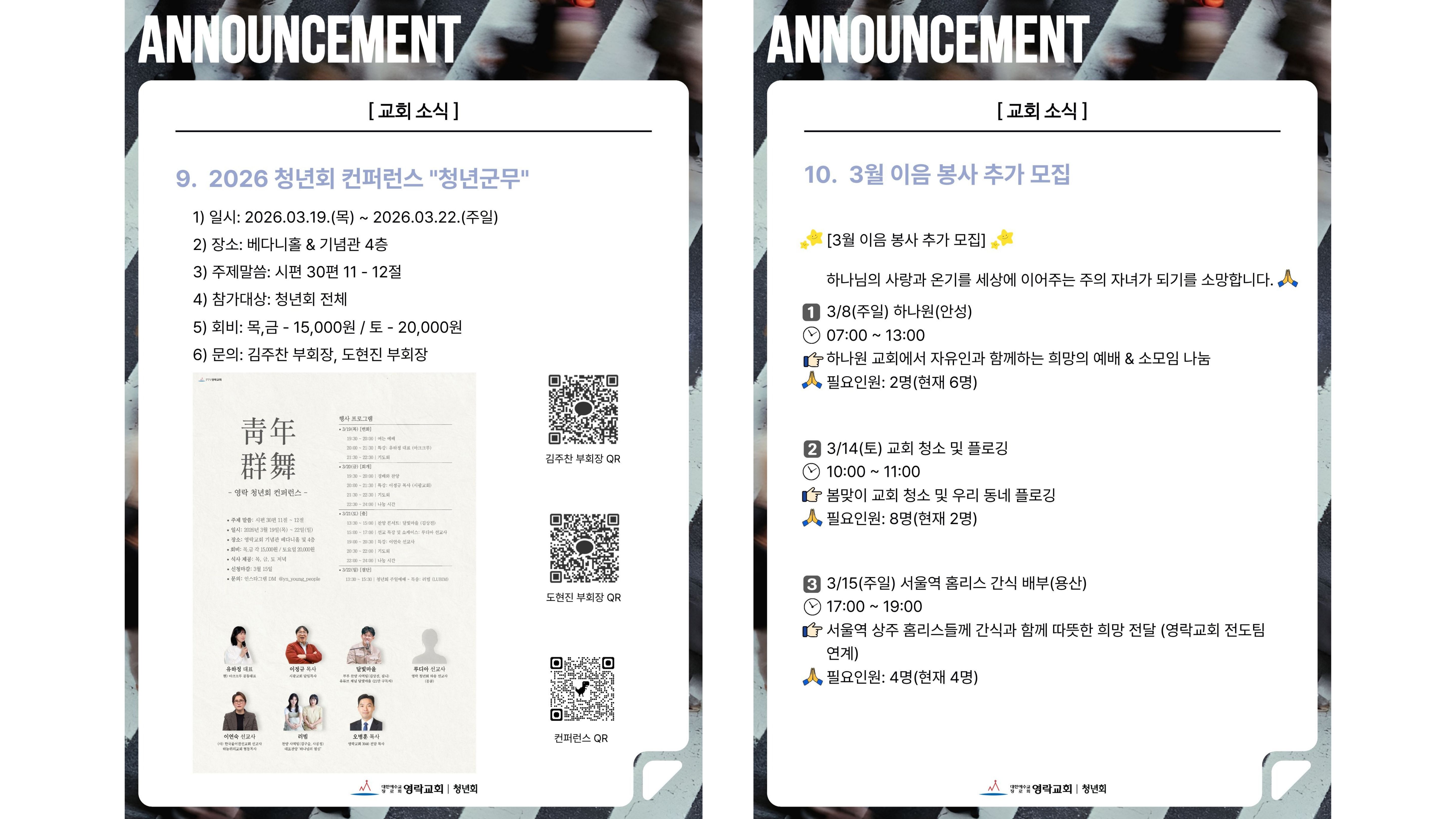 2026년 3월 1일 청년회 예배는 "현장예배"와 "온라인 생중계"로 병행하여 드려지게 됩니다.