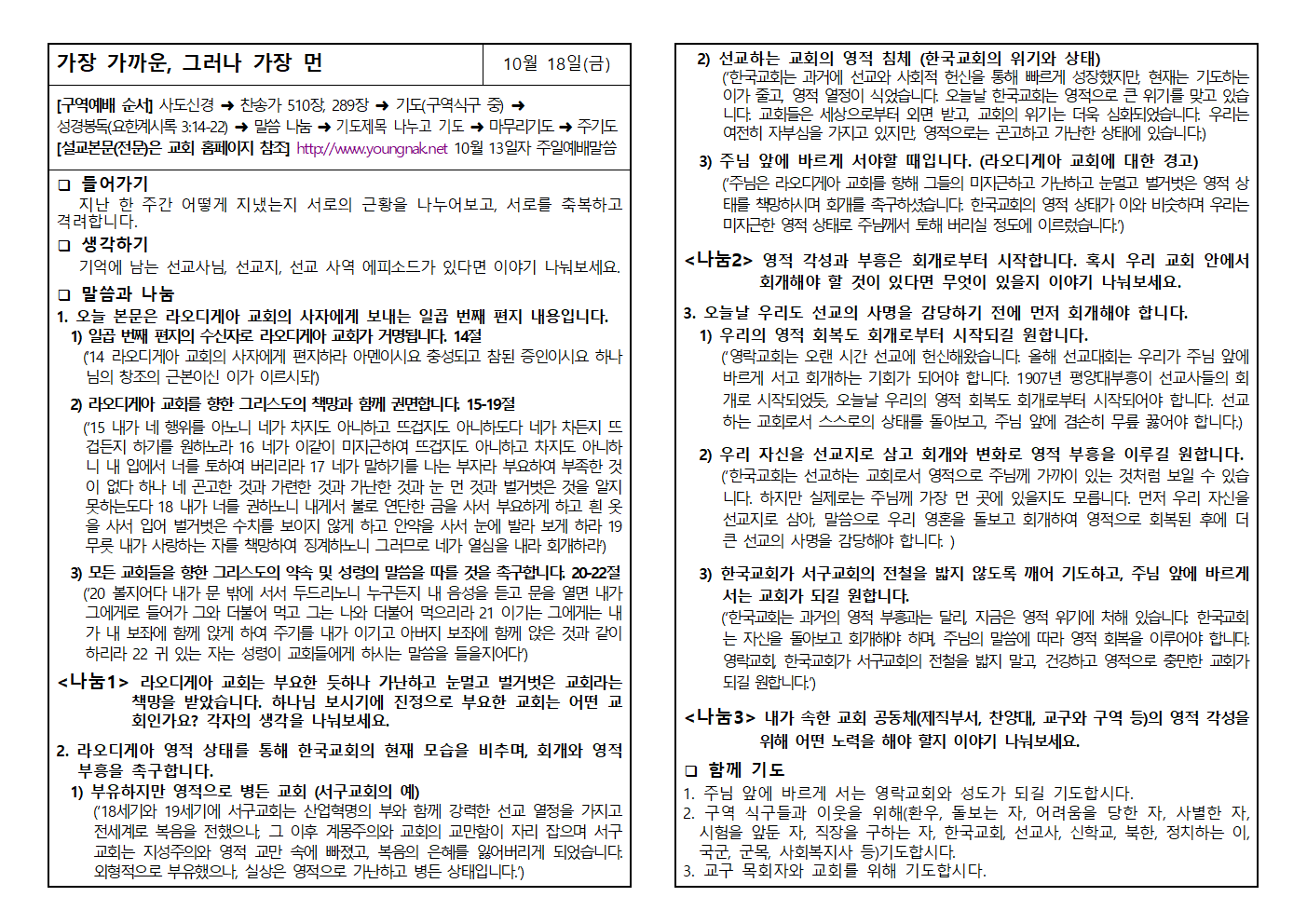 [구역예배 순서] 사도신경 ➜ 찬송가 510장, 289장 ➜ 기도(구역식구 중) ➜ 성경 봉독(요한계시록 3:14-22) ➜ 말씀 나눔 ➜ 기도제목 나누고 기도 ➜ 마무리기도 ➜ 주기도