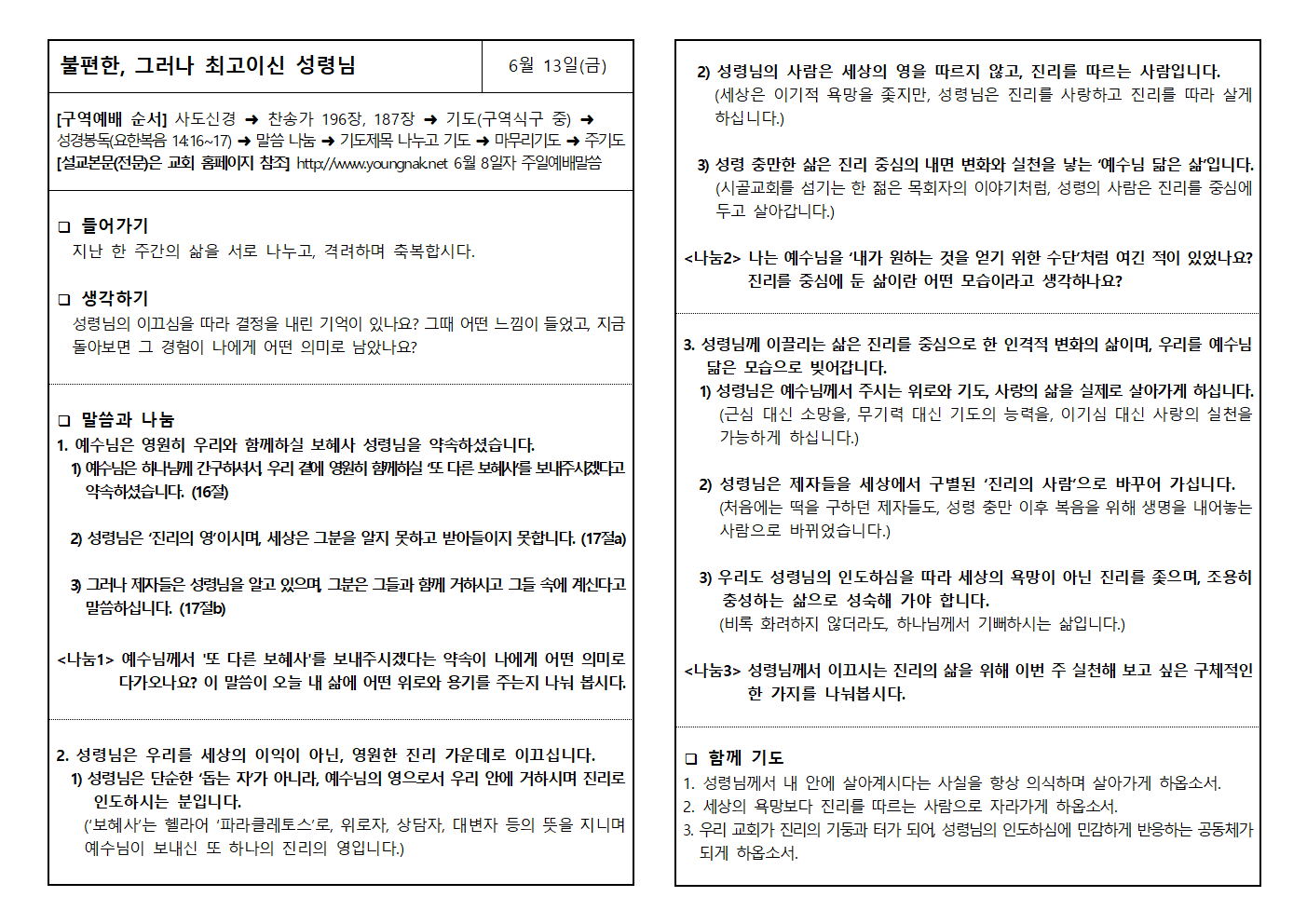 [구역예배 순서] 사도신경 ➜찬송가 196장, 187장 ➜ 기도(구역식구 중) ➜ 성경봉독(요한복음 14:16~17) ➜ 말씀 나눔 ➜ 기도제목 나누고 기도 ➜ 마무리기도 ➜ 주기도