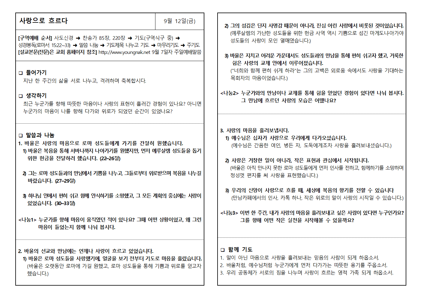 [구역예배 순서] 사도신경 ➜찬송가 85장, 220장 ➜ 기도(구역식구 중) ➜ 성경봉독(로마서 15:22~33) ➜ 말씀 나눔 ➜ 기도제목 나누고 기도 ➜ 마무리기도 ➜ 주기도