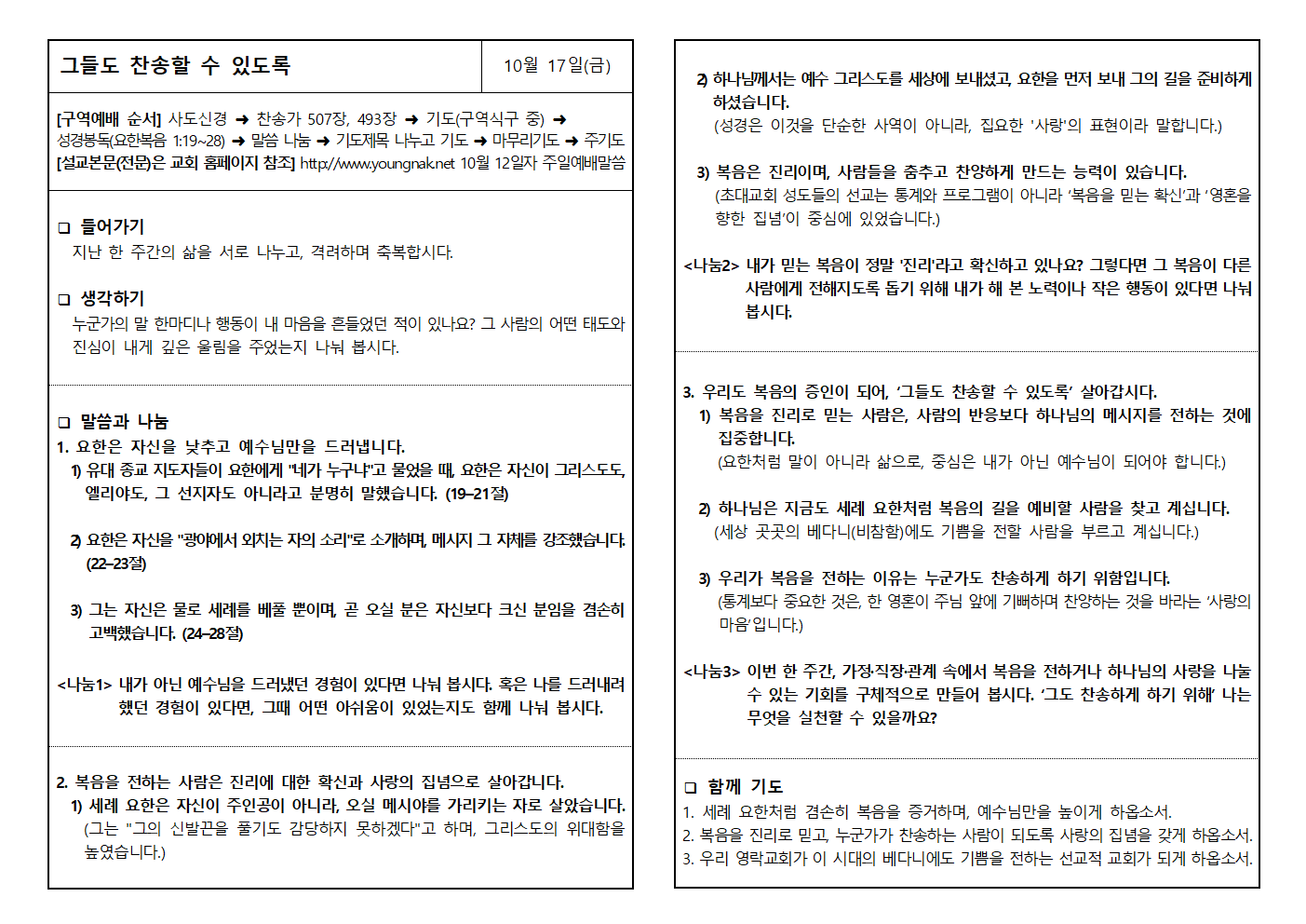 [구역예배 순서] 사도신경 ➜찬송가 507장, 493장 ➜ 기도(구역식구 중) ➜ 성경봉독(요한복음 1:19~28) ➜ 말씀 나눔 ➜ 기도제목 나누고 기도 ➜ 마무리기도 ➜ 주기도