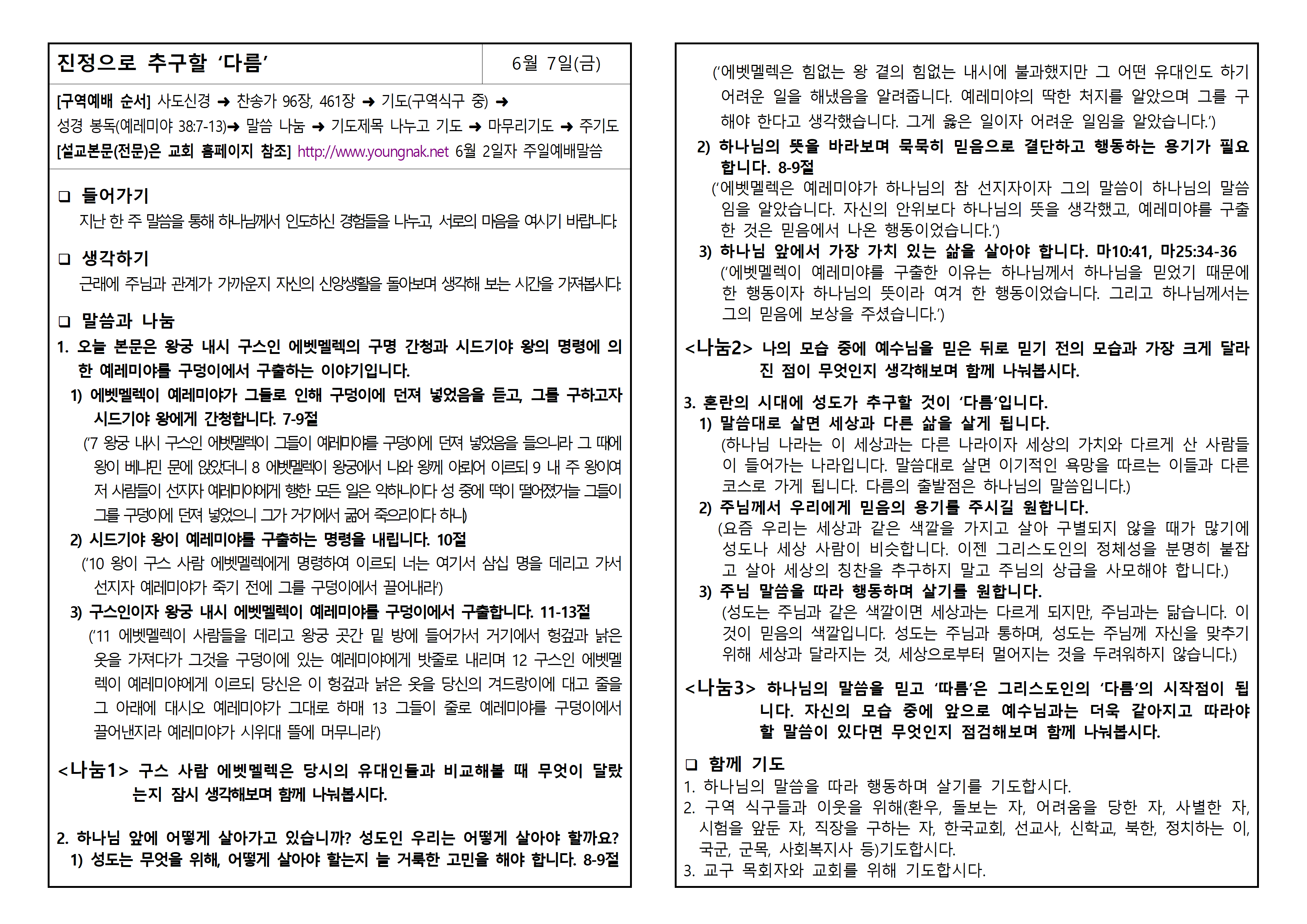 [구역예배 순서] 사도신경 ➜ 찬송가 96장, 461장 ➜ 기도(구역식구 중) ➜ 성경 봉독(예레미야 38:7-13) ➜ 말씀 나눔 ➜ 기도제목 나누고 기도 ➜ 마무리기도 ➜ 주기도