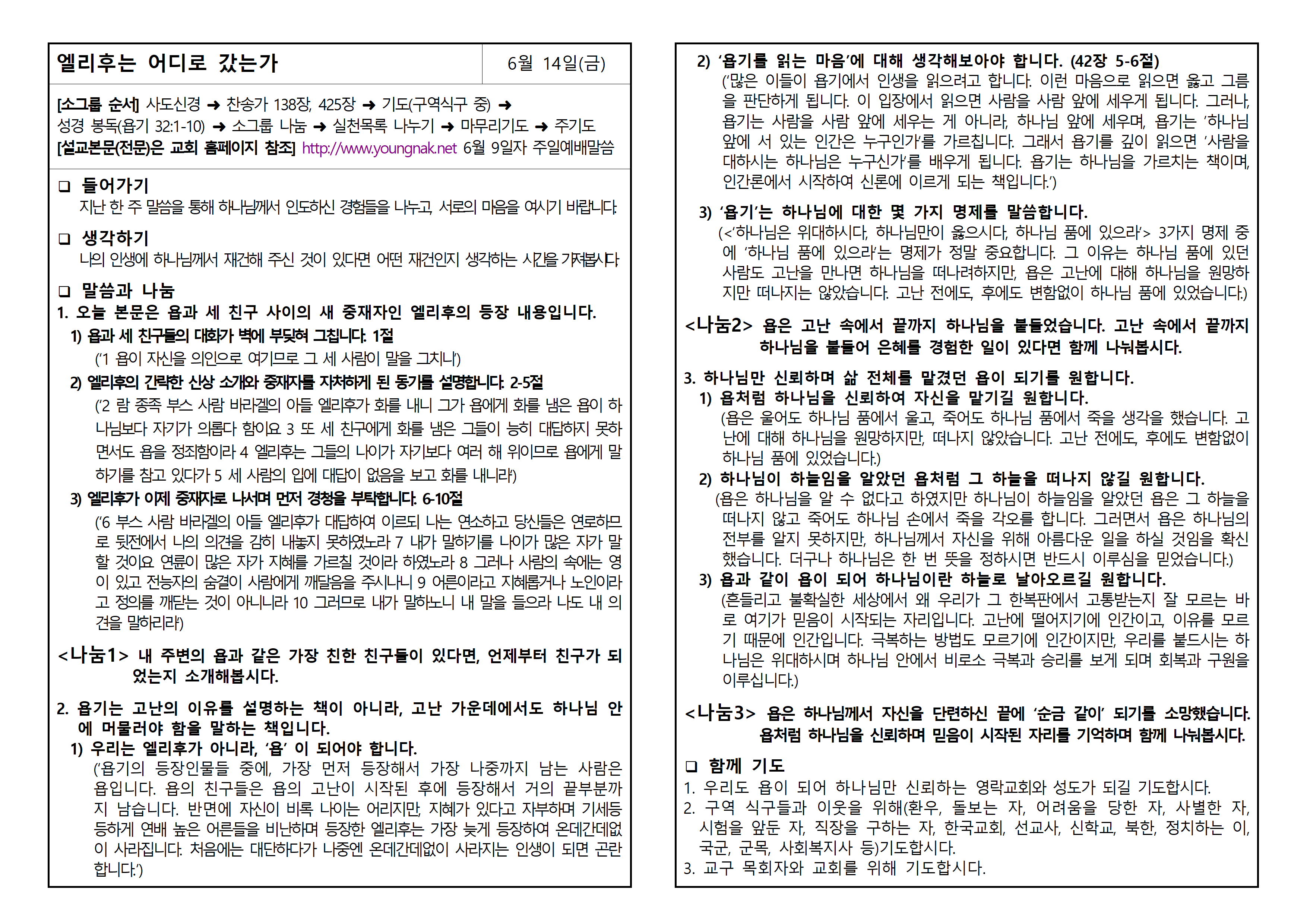 [구역예배 순서] 사도신경 ➜ 찬송가 138장, 425장 ➜ 기도(구역식구 중) ➜ 성경 봉독(욥기 32:1-10) ➜ 말씀 나눔 ➜ 기도제목 나누고 기도 ➜ 마무리기도 ➜ 주기도